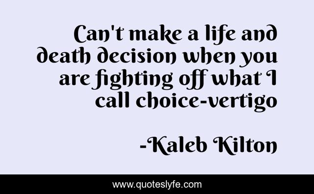 This page presents the quote "Can't make a life and death decision when you are fighting off what I call choice-vertigo". Author of this quote is Kaleb Kilton. This quote is about decision, death, life, choice, fight,.