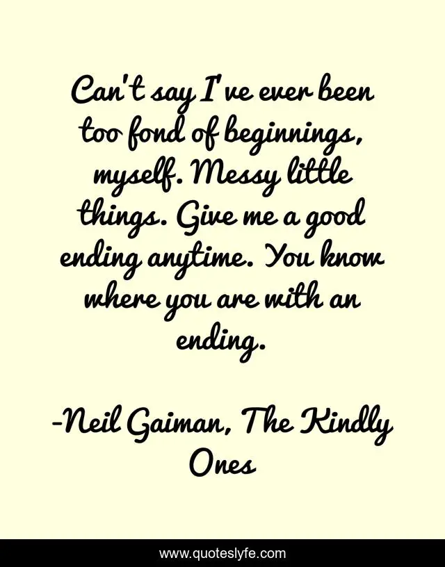 This page presents the quote "Can't say I've ever been too fond of beginnings, myself. Messy little things. Give me a good ending anytime. You know where you are with an ending.". Author of this quote is Neil Gaiman, The Kindly Ones. This quote is about endings, fiction,.