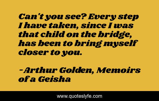 This page presents the quote "Can't you see? Every step I have taken, since I was that child on the bridge, has been to bring myself closer to you.". Author of this quote is Arthur Golden, Memoirs of a Geisha. This quote is about love, affection,.