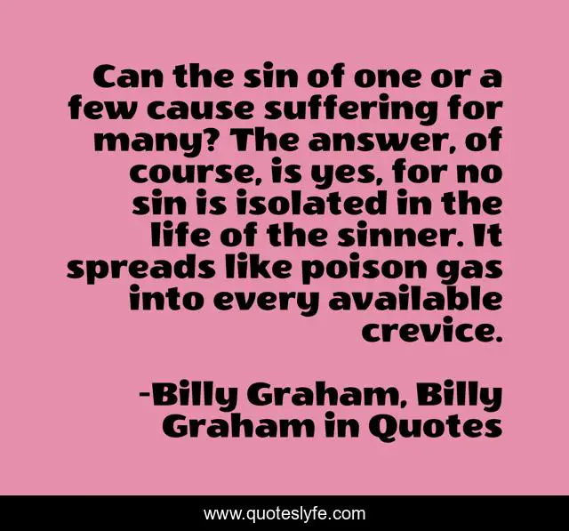 This page presents the quote "Can the sin of one or a few cause suffering for many? The answer, of course, is yes, for no sin is isolated in the life of the sinner. It spreads like poison gas into every available crevice.". Author of this quote is Billy Graham, Billy Graham in Quotes. This quote is about suffering, billy-graham, sin, sinner,.