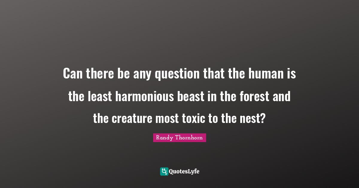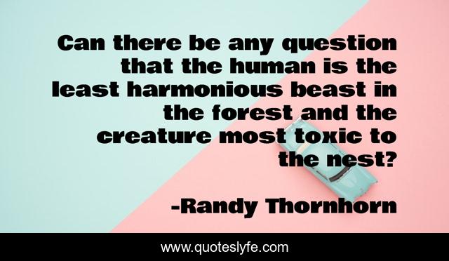 This page presents the quote "Can there be any question that the human is the least harmonious beast in the forest and the creature most toxic to the nest?". Author of this quote is Randy Thornhorn. This quote is about nature-s-beauty, nuclear-proliferation, nuclear-threat, peace-on-earth, nature-of-man, nature, nuclear-war, nuclear-weapons, global-warming,.