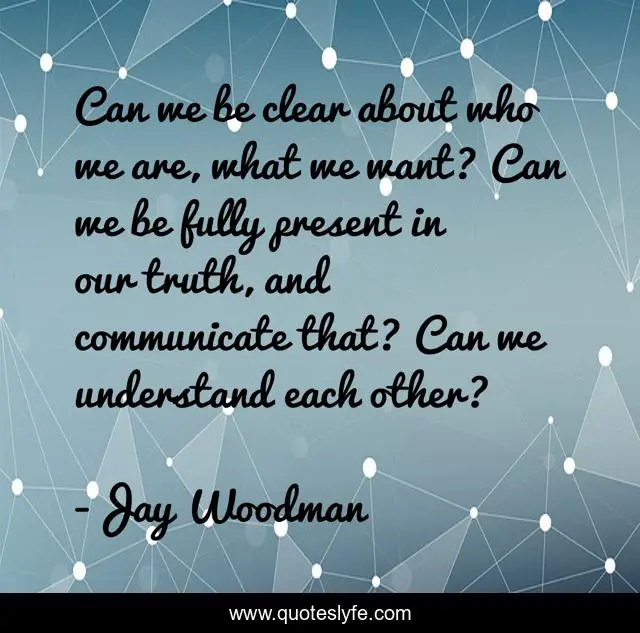 This page presents the quote "Can we be clear about who we are, what we want? Can we be fully present in our truth, and communicate that? Can we understand each other?". Author of this quote is Jay Woodman. This quote is about communication, clarity, present, truth, understanding,.