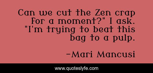 This page presents the quote "Can we cut the Zen crap for a moment?" I ask. "I'm trying to beat this bag to a pulp.". Author of this quote is Mari Mancusi. This quote is about fighting, zen, blood-coven, rayne,.