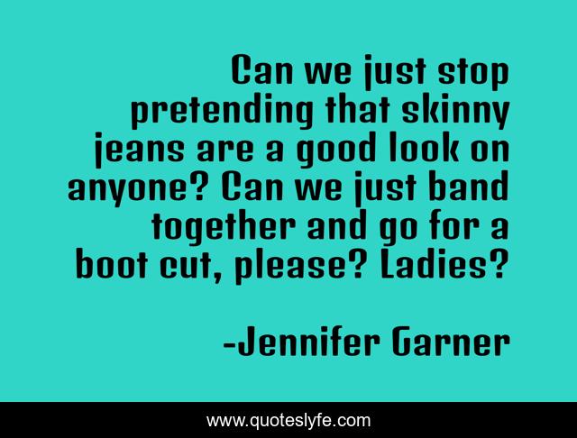 This page presents the quote "Can we just stop pretending that skinny jeans are a good look on anyone? Can we just band together and go for a boot cut, please? Ladies?". Author of this quote is Jennifer Garner. This quote is about fashion, jeans, skinnyjeans, women,.