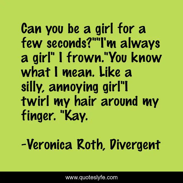 This page presents the quote "Can you be a girl for a few seconds?""I'm always a girl" I frown."You know what I mean. Like a silly, annoying girl"I twirl my hair around my finger. "Kay.". Author of this quote is Veronica Roth, Divergent. This quote is about funny, christina, humor, tris, comedy, veronica-roth, divergent,.