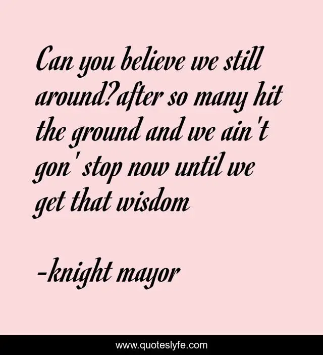This page presents the quote "Can you believe we still around?after so many hit the ground and we ain't gon' stop now until we get that wisdom". Author of this quote is knight mayor. This quote is about humor, wisdom,.