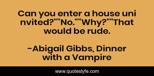 This page presents the quote "Can you enter a house uninvited?""No.""Why?""That would be rude.". Author of this quote is Abigail Gibbs, Dinner with a Vampire. This quote is about sarcasm, fabian, humor, vampire-mythology, violet,.