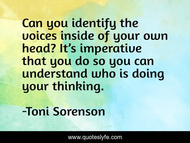 This page presents the quote "Can you identify the voices inside of your own head? It’s imperative that you do so you can understand who is doing your thinking.". Author of this quote is Toni Sorenson. This quote is about brain, awareness, thoughts,.