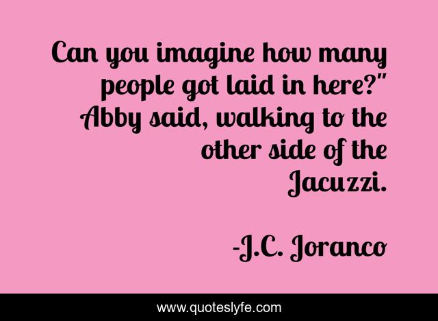 This page presents the quote "Can you imagine how many people got laid in here?" Abby said, walking to the other side of the Jacuzzi.". Author of this quote is J.C. Joranco. This quote is about fiction-novel, fiction, literary-fiction, humor, jacuzzis,.