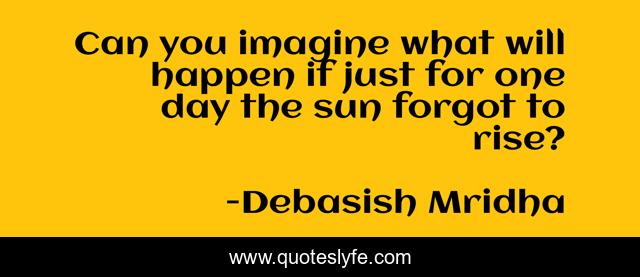 This page presents the quote "Can you imagine what will happen if just for one day the sun forgot to rise?". Author of this quote is Debasish Mridha. This quote is about sun-forgot-to-rise, what-would-happen, philosophy, debasish-mridha, quotes, can-you-imagine, inspirational, enthusiasm, debasish-mridha-m-d,.