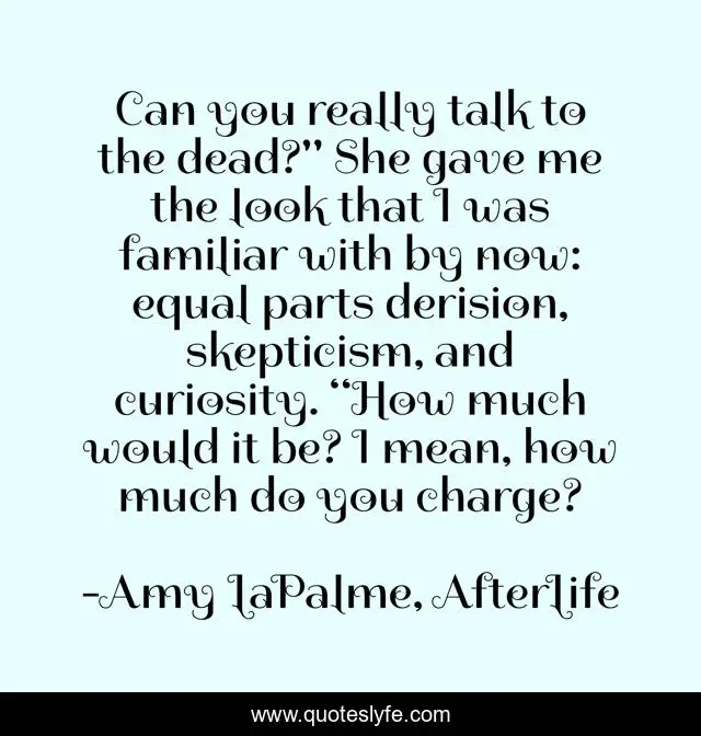 This page presents the quote "Can you really talk to the dead?" She gave me the look that I was familiar with by now: equal parts derision, skepticism, and curiosity. “How much would it be? I mean, how much do you charge?". Author of this quote is Amy LaPalme, AfterLife. This quote is about afterlife, ghosts, dead,.