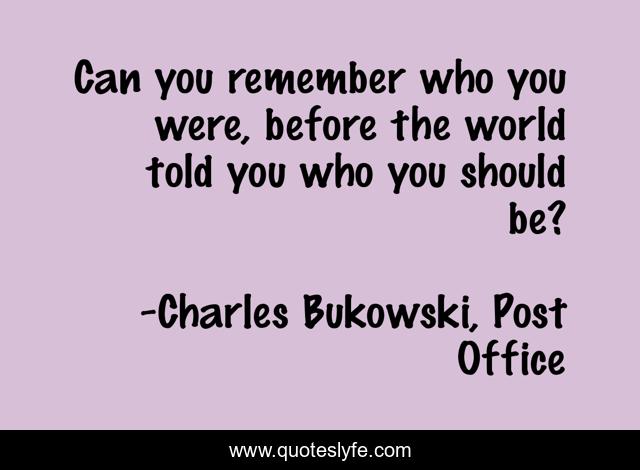 This page presents the quote "Can you remember who you were, before the world told you who you should be?". Author of this quote is Charles Bukowski, Post Office. This quote is about poem, life, posthumous-modern-writer, inspirational, writer, poetry, autobiographical, poetry-life, satirical,.