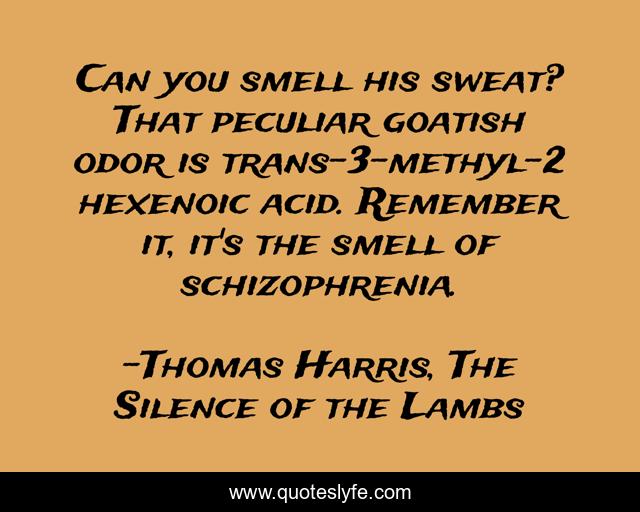 This page presents the quote "Can you smell his sweat? That peculiar goatish odor is trans-3-methyl-2 hexenoic acid. Remember it, it's the smell of schizophrenia.". Author of this quote is Thomas Harris, The Silence of the Lambs. This quote is about psychology, science, horror, schizophrenia, psychiatry, hannibal, the-silence-of-the-lambs, mental-illness,.