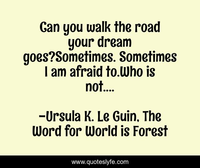 This page presents the quote "Can you walk the road your dream goes?Sometimes. Sometimes I am afraid to.Who is not....". Author of this quote is Ursula K. Le Guin, The Word for World is Forest. This quote is about walking-the-dream, dream, road,.