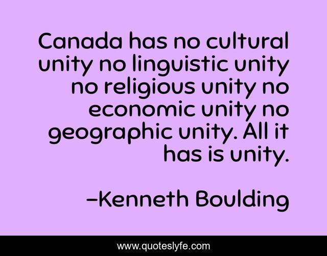 This page presents the quote "Canada has no cultural unity no linguistic unity no religious unity no economic unity no geographic unity. All it has is unity.". Author of this quote is Kenneth Boulding. This quote is about canada, canadians,.