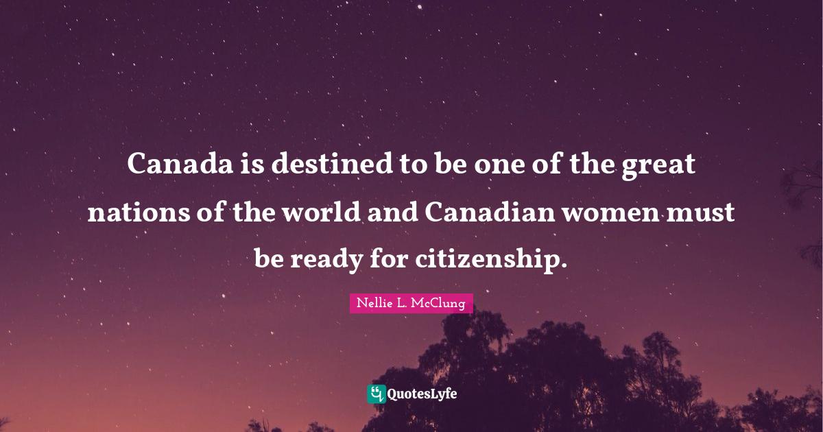 This page presents the quote "Canada is destined to be one of the great nations of the world and Canadian women must be ready for citizenship.". Author of this quote is Nellie L. McClung. This quote is about destined, citizenship, canada, great nations, women, ready, world,.