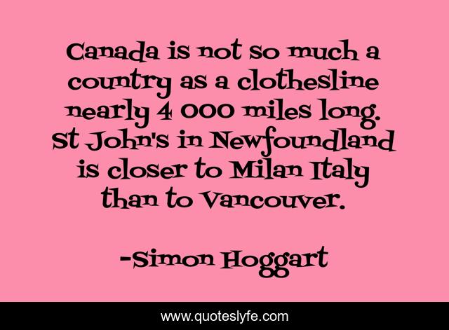 This page presents the quote "Canada is not so much a country as a clothesline nearly 4 000 miles long. St John's in Newfoundland is closer to Milan Italy than to Vancouver.". Author of this quote is Simon Hoggart. This quote is about canada, canadians,.