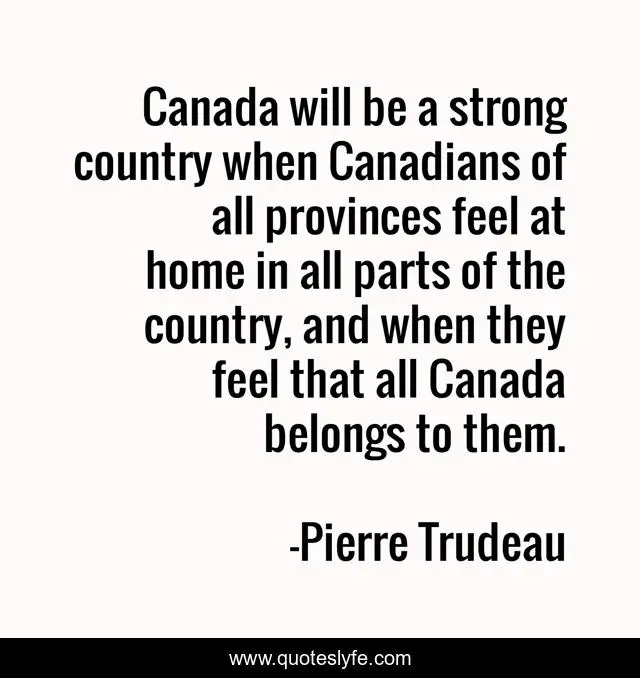 This page presents the quote "Canada will be a strong country when Canadians of all provinces feel at home in all parts of the country, and when they feel that all Canada belongs to them.". Author of this quote is Pierre Trudeau. This quote is about canada, country, strong,.