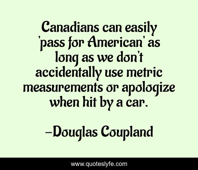 This page presents the quote "Canadians can easily 'pass for American' as long as we don't accidentally use metric measurements or apologize when hit by a car.". Author of this quote is Douglas Coupland. This quote is about american, long, apologize,.