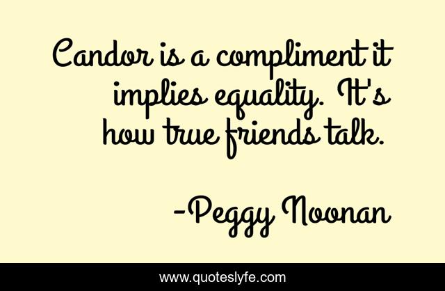 This page presents the quote "Candor is a compliment it implies equality. It's how true friends talk.". Author of this quote is Peggy Noonan. This quote is about friends, true, compliment,.