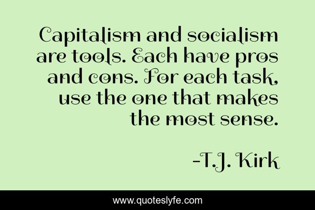 This page presents the quote "Capitalism and socialism are tools. Each have pros and cons. For each task, use the one that makes the most sense.". Author of this quote is T.J. Kirk. This quote is about socialism, capitalism,.