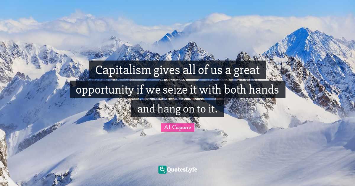 This page presents the quote "Capitalism gives all of us a great opportunity if we seize it with both hands and hang on to it.". Author of this quote is Al Capone. This quote is about great opportunity, hands, capitalism, giving, opportunity,.