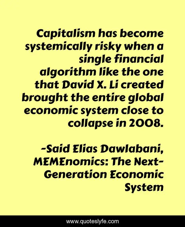 This page presents the quote "Capitalism has become systemically risky when a single financial algorithm like the one that David X. Li created brought the entire global economic system close to collapse in 2008.". Author of this quote is Said Elias Dawlabani, MEMEnomics: The Next-Generation Economic System. This quote is about global-economic-crisis, financial-derivatives, risk,.