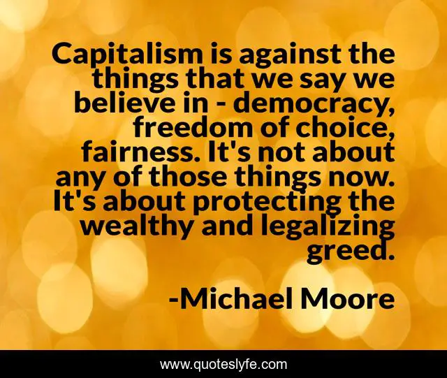 This page presents the quote "Capitalism is against the things that we say we believe in - democracy, freedom of choice, fairness. It's not about any of those things now. It's about protecting the wealthy and legalizing greed.". Author of this quote is Michael Moore. This quote is about believe, democracy, greed,.