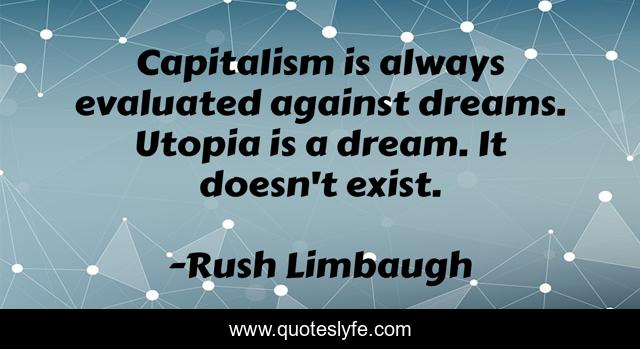 This page presents the quote "Capitalism is always evaluated against dreams. Utopia is a dream. It doesn't exist.". Author of this quote is Rush Limbaugh. This quote is about utopia, dream, capitalism,.