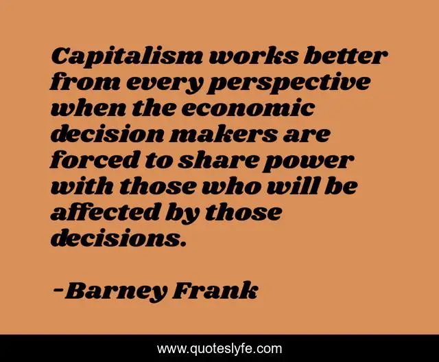 This page presents the quote "Capitalism works better from every perspective when the economic decision makers are forced to share power with those who will be affected by those decisions.". Author of this quote is Barney Frank. This quote is about decision, decisions,.