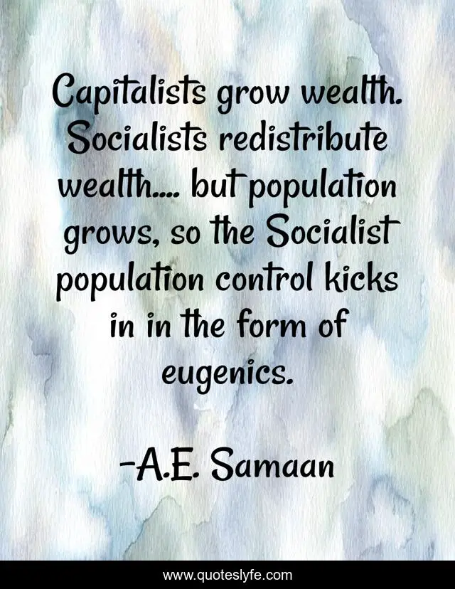 This page presents the quote "Capitalists grow wealth. Socialists redistribute wealth.... but population grows, so the Socialist population control kicks in in the form of eugenics.". Author of this quote is A.E. Samaan. This quote is about wealth-redistribution, environmentalists, population-control, free-market-ideology, eugenics, progressivism, eugenicist, socialism, democrats,.