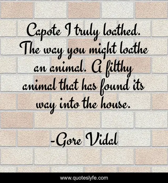 This page presents the quote "Capote I truly loathed. The way you might loathe an animal. A filthy animal that has found its way into the house.". Author of this quote is Gore Vidal. This quote is about hatred, writers, insults,.