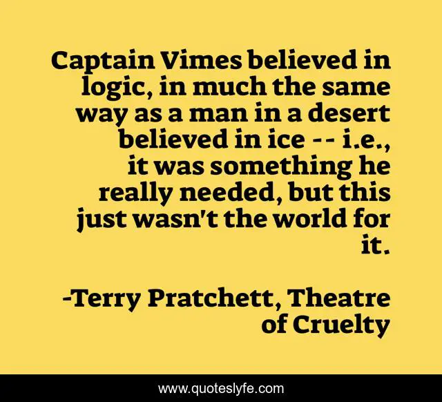 "Terry Pratchett, Theatre of Cruelty Quotes." Quoteslyfe.com, 2025. Fri. 05 Dec. 2025. <https://www.quoteslyfe.com/quote/Captain-Vimes-believed-in-logic-in-much-228894>.