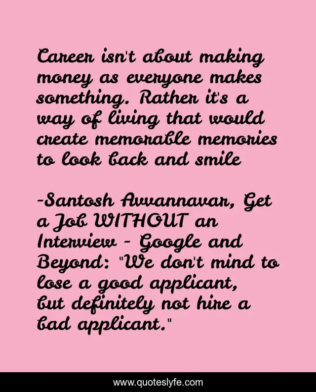 This page presents the quote "Career isn't about making money as everyone makes something. Rather it's a way of living that would create memorable memories to look back and smile". Author of this quote is Santosh Avvannavar, Get a Job WITHOUT an Interview - Google and Beyond: "We don't mind to lose a good applicant, but definitely not hire a bad applicant.". This quote is about career, interview, job,.