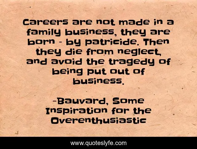 This page presents the quote "Careers are not made in a family business, they are born – by patricide. Then they die from neglect, and avoid the tragedy of being put out of business.". Author of this quote is Bauvard, Some Inspiration for the Overenthusiastic. This quote is about funny, comedy, humor, careers, family,.