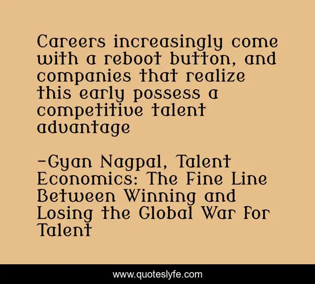 This page presents the quote "Careers increasingly come with a reboot button, and companies that realize this early possess a competitive talent advantage". Author of this quote is Gyan Nagpal, Talent Economics: The Fine Line Between Winning and Losing the Global War for Talent. This quote is about jobs, employment, economics, talent, resignation, careers,.