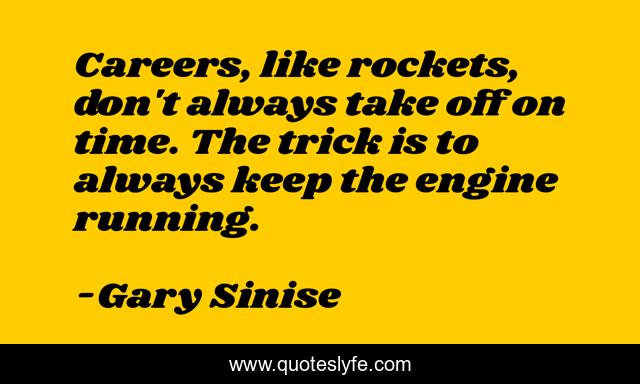 This page presents the quote "Careers, like rockets, don't always take off on time. The trick is to always keep the engine running.". Author of this quote is Gary Sinise. This quote is about always, like, time,.