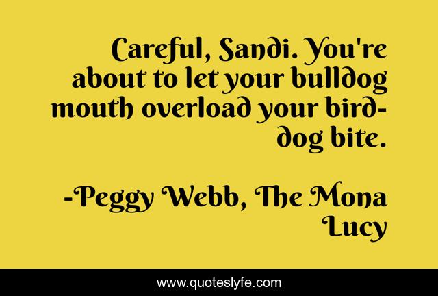 This page presents the quote "Careful, Sandi. You're about to let your bulldog mouth overload your bird-dog bite.". Author of this quote is Peggy Webb, The Mona Lucy. This quote is about bulldog, mouth, mouthy, regret,.