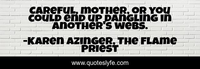 This page presents the quote "Careful, mother, or you could end up dangling in another's webs.". Author of this quote is Karen Azinger, The Flame Priest. This quote is about magic, fantasy, adventure, fantasy-fiction, action, epic,.