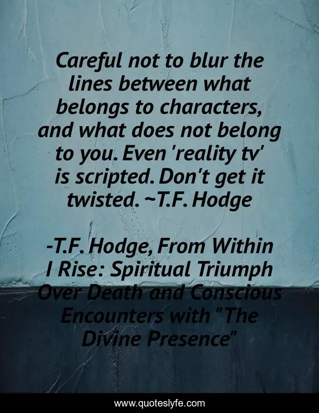 This page presents the quote "Careful not to blur the lines between what belongs to characters, and what does not belong to you. Even 'reality tv' is scripted. Don't get it twisted. ~T.F. Hodge". Author of this quote is T.F. Hodge, From Within I Rise: Spiritual Triumph Over Death and Conscious Encounters with "The Divine Presence". This quote is about real, fantasy, life, quotes-to-live-by, reality,.