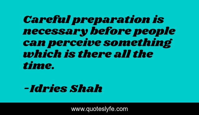 This page presents the quote "Careful preparation is necessary before people can perceive something which is there all the time.". Author of this quote is Idries Shah. This quote is about perception, knowledge, sufi, cleansing, sufism, sufis,.