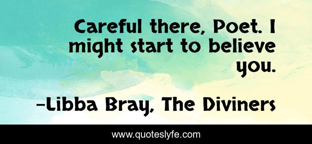 This page presents the quote "Careful there, Poet. I might start to believe you.". Author of this quote is Libba Bray, The Diviners. This quote is about poet, the-diviners, libba-bray,.