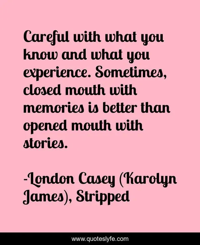 This page presents the quote "Careful with what you know and what you experience. Sometimes, closed mouth with memories is better than opened mouth with stories.". Author of this quote is London Casey (Karolyn James), Stripped. This quote is about memories, stories, experience,.