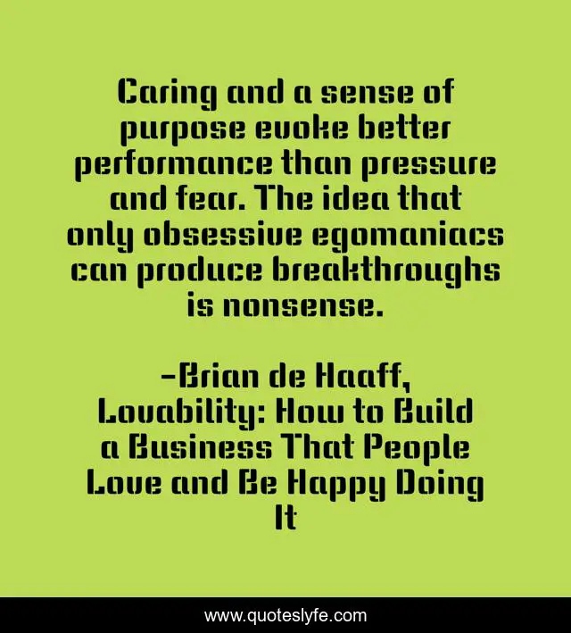 This page presents the quote "Caring and a sense of purpose evoke better performance than pressure and fear. The idea that only obsessive egomaniacs can produce breakthroughs is nonsense.". Author of this quote is Brian de Haaff, Lovability: How to Build a Business That People Love and Be Happy Doing It. This quote is about leadership, product-management, business,.