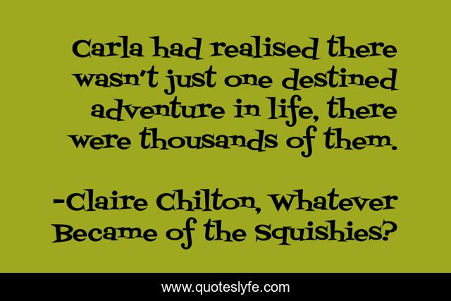 This page presents the quote "Carla had realised there wasn’t just one destined adventure in life, there were thousands of them.". Author of this quote is Claire Chilton, Whatever Became of the Squishies?. This quote is about fantasy, teens, young-adult-novels, young-adult,.