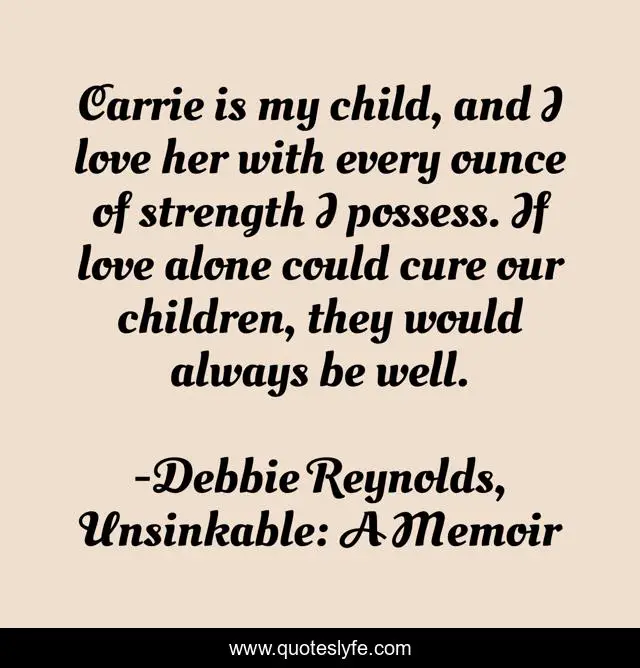 This page presents the quote "Carrie is my child, and I love her with every ounce of strength I possess. If love alone could cure our children, they would always be well.". Author of this quote is Debbie Reynolds, Unsinkable: A Memoir. This quote is about parenting, love, affection,.