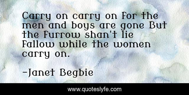This page presents the quote "Carry on carry on for the men and boys are gone But the furrow shan't lie fallow while the women carry on.". Author of this quote is Janet Begbie. This quote is about positive, confidence,.
