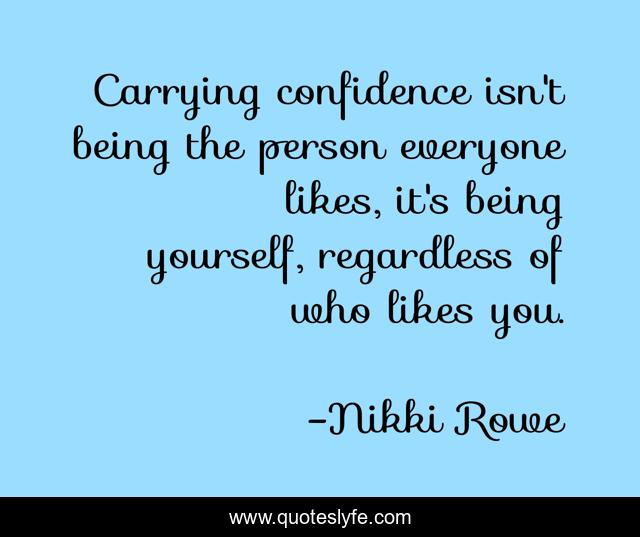 This page presents the quote "Carrying confidence isn't being the person everyone likes, it's being yourself, regardless of who likes you.". Author of this quote is Nikki Rowe. This quote is about confidence, woman, beauty, empower, truth, women,.