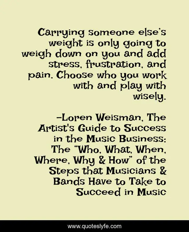 "Loren Weisman, The Artist's Guide to Success in the Music Business: The “Who, What, When, Where, Why & How” of the Steps that Musicians & Bands Have to Take to Succeed in Music Quotes." Quoteslyfe.com, 2025. Fri. 05 Dec. 2025. <https://www.quoteslyfe.com/quote/Carrying-someone-else-s-weight-is-only-32534>.