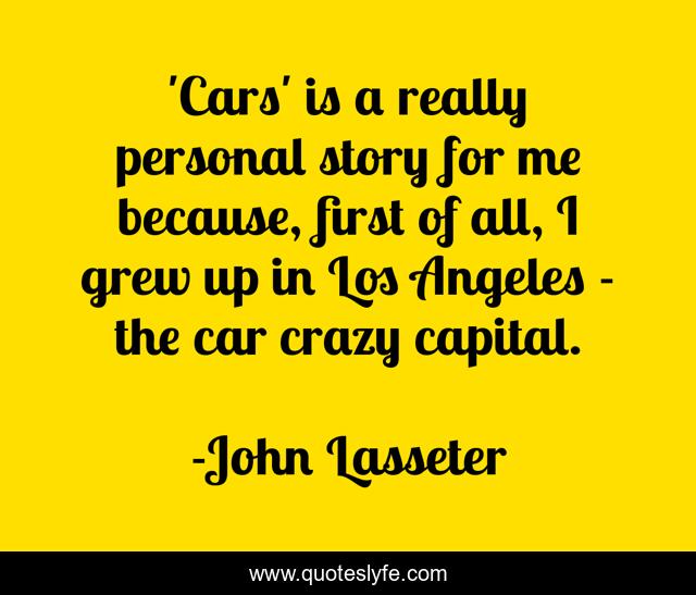 This page presents the quote "'Cars' is a really personal story for me because, first of all, I grew up in Los Angeles - the car crazy capital.". Author of this quote is John Lasseter. This quote is about me, crazy, story,.